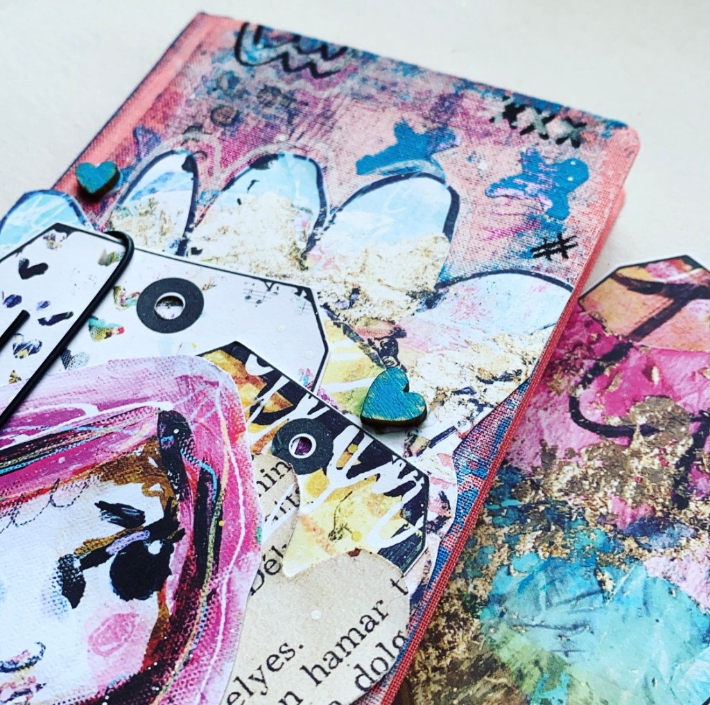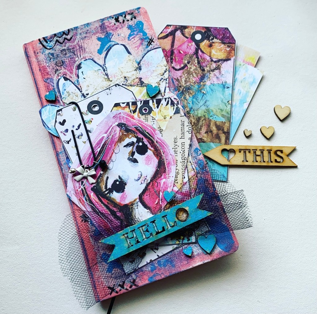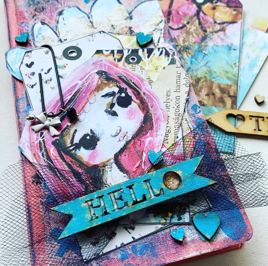 It was hard to choose which elements of the papers that I wanted to use, once I had chosen them I fussy cut them out, ready to layer on my cover. Using the matte medium from Finnabair I glued them into the piece, adding a paperclip to the tag before setting it in place. Using a few elements from my stash, I added the finishing touches with some tulle and wooden embellishments.