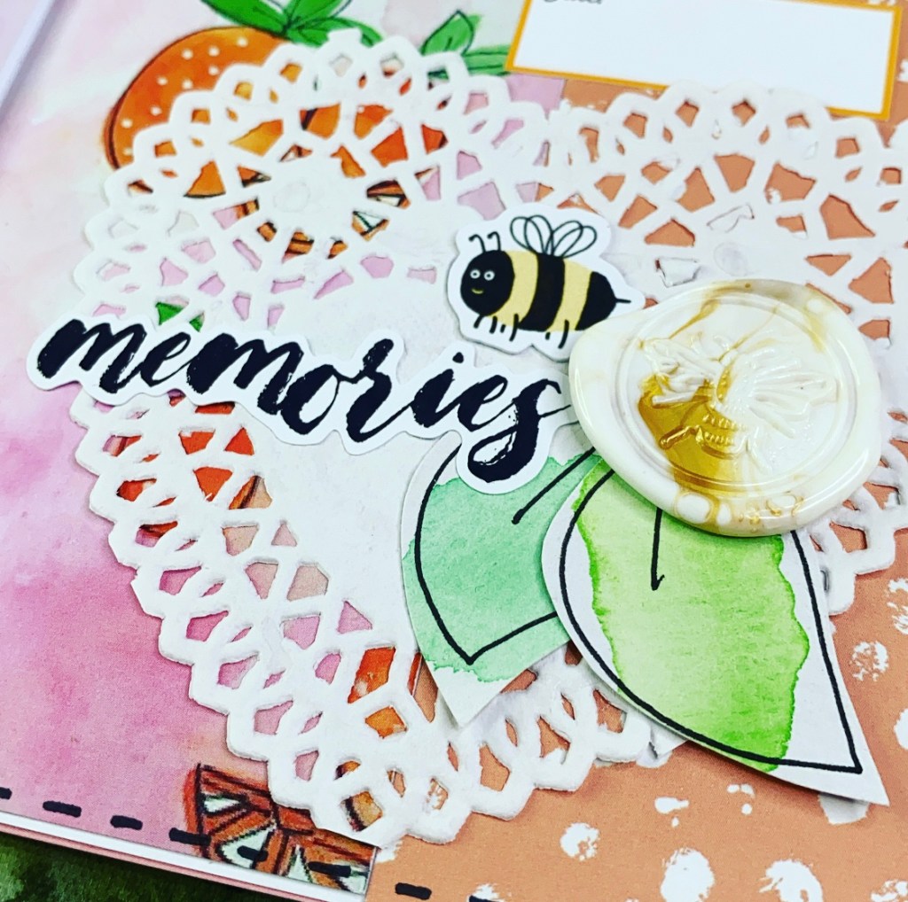 On the right hand page I have created the cluster in the bottom corner using the heart doilie, watercolour leaves and the wax seal from Bumble and Bluebells then finished with one of the word stickers as my title.