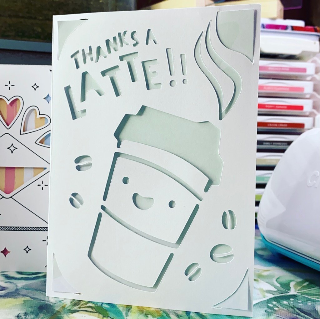 The 3rd card inspired by my love of coffee, Thanks a latte. I love his cute smiley face, I have chosen the green watercolour effect paper for the backing instead of a pattern paper.