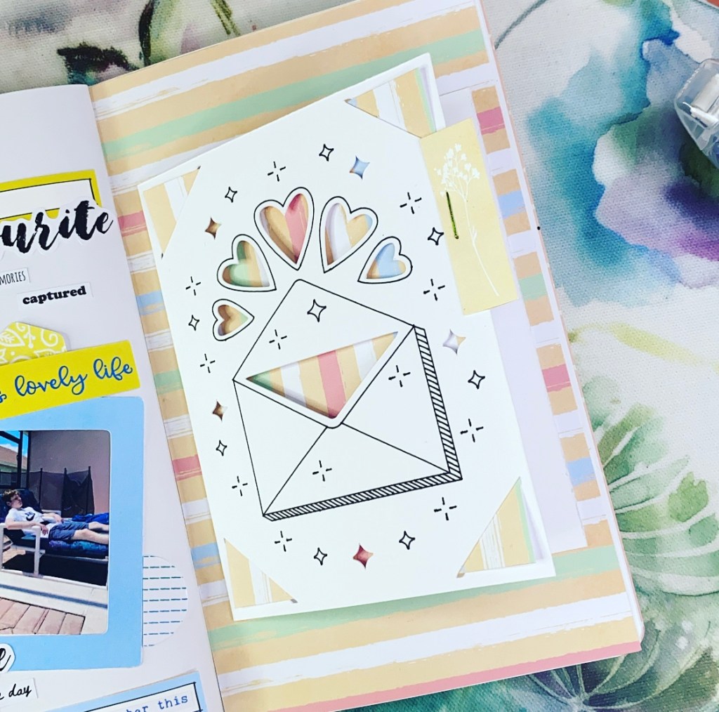 The more I look at the cards the more I wanted to add them into my journal. So I took another piece of the stripey paper and used it as a background on the right side and stuck down the envelope card creating a hidden photo and journaling spot.