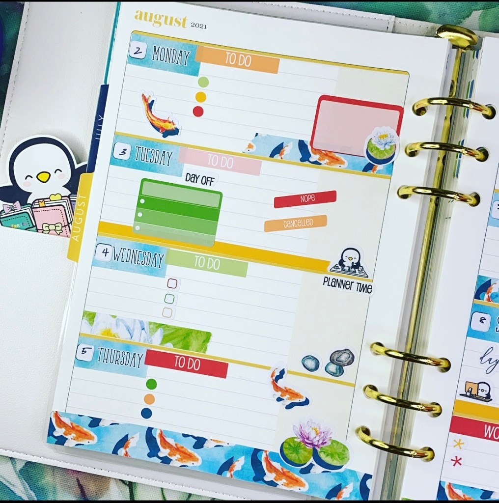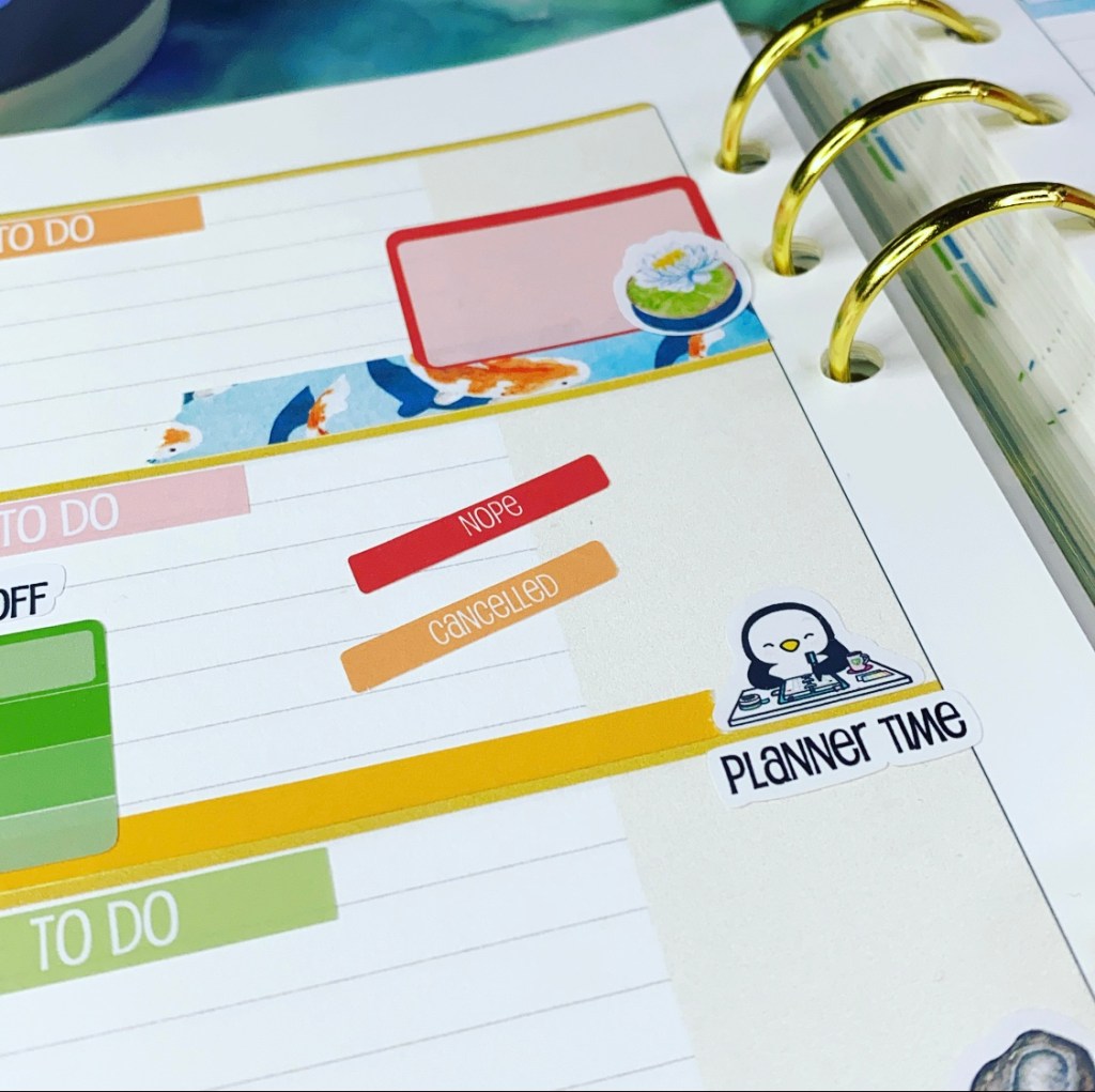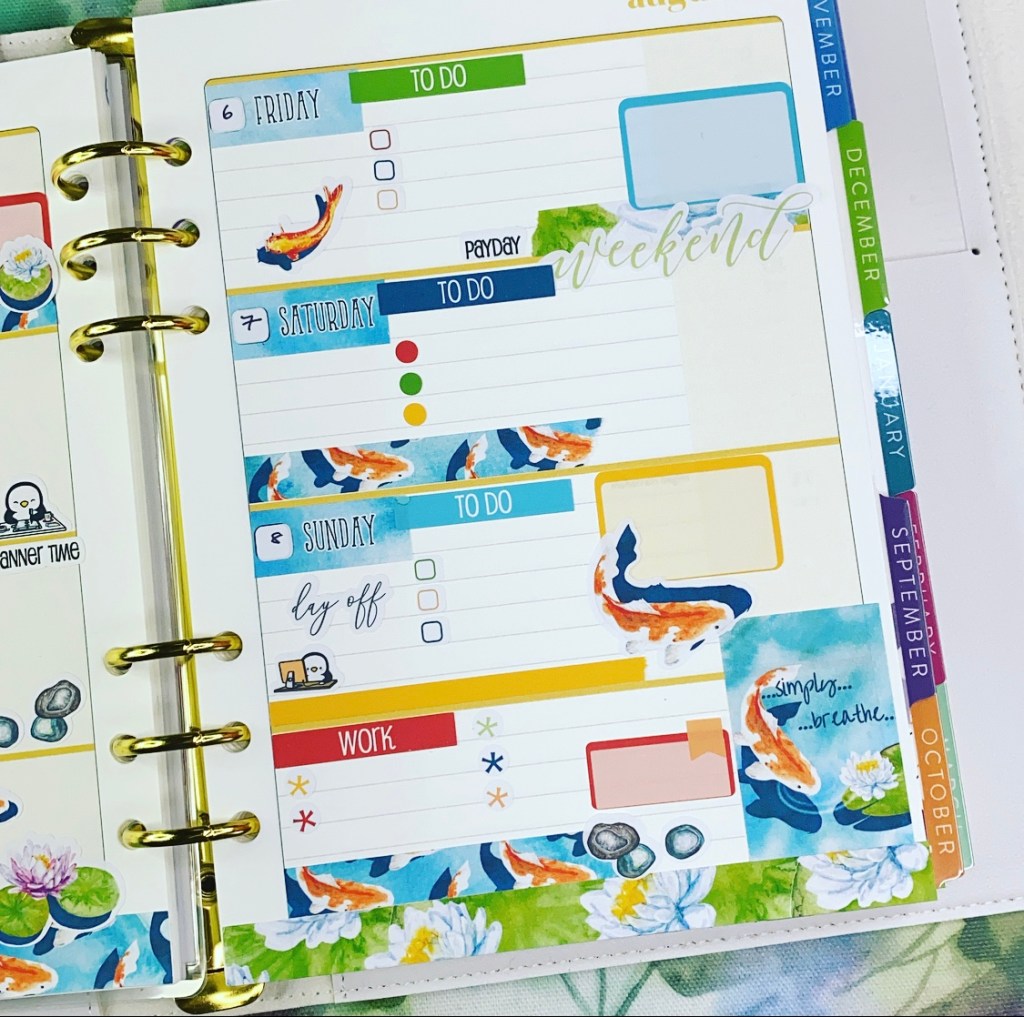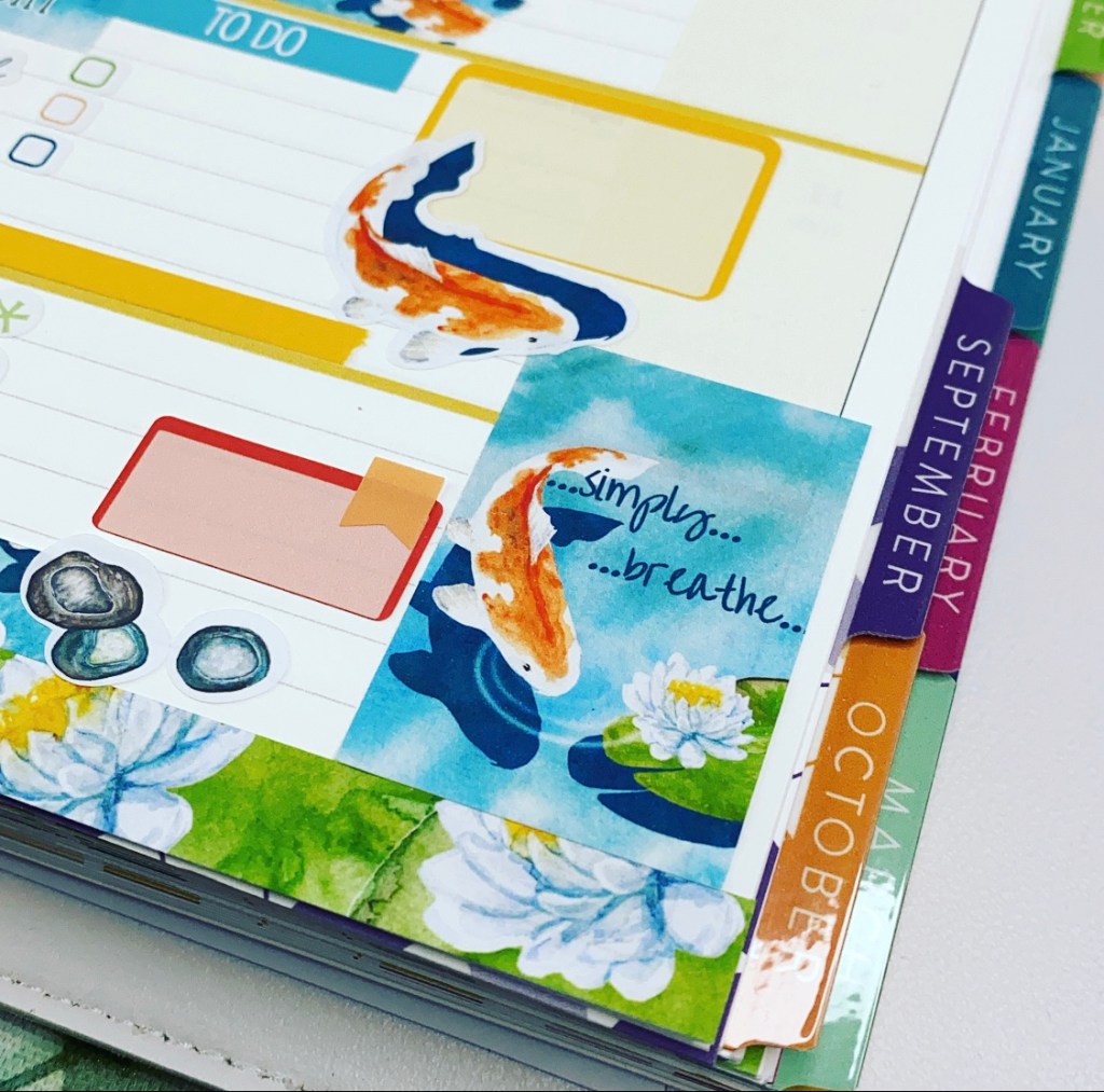 I love to layer my stickers for more dimension, I love how each koi fish has a shadow making it pop from the pages. And the message in the full box reminding me to Simply breathe.