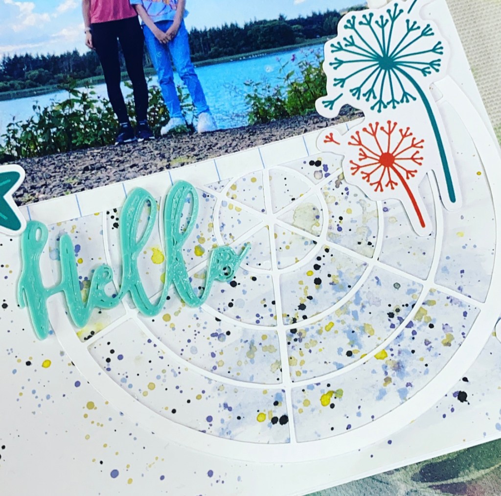 Using my watercolours I added blues, yellow and splatters of black. I created a colour wheel cutfile on my cricut to add to my pages, cutting one in half so I could have it on both pages.