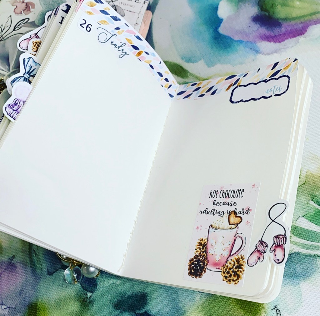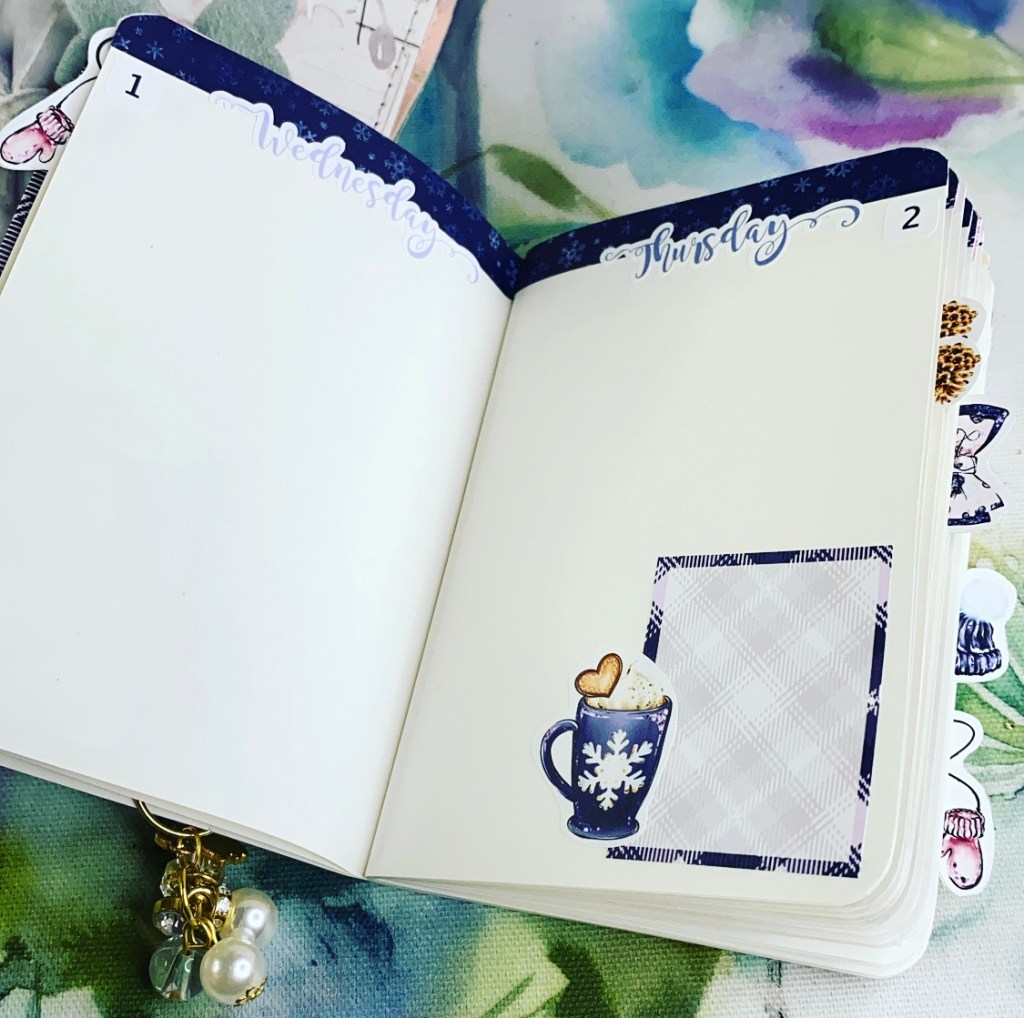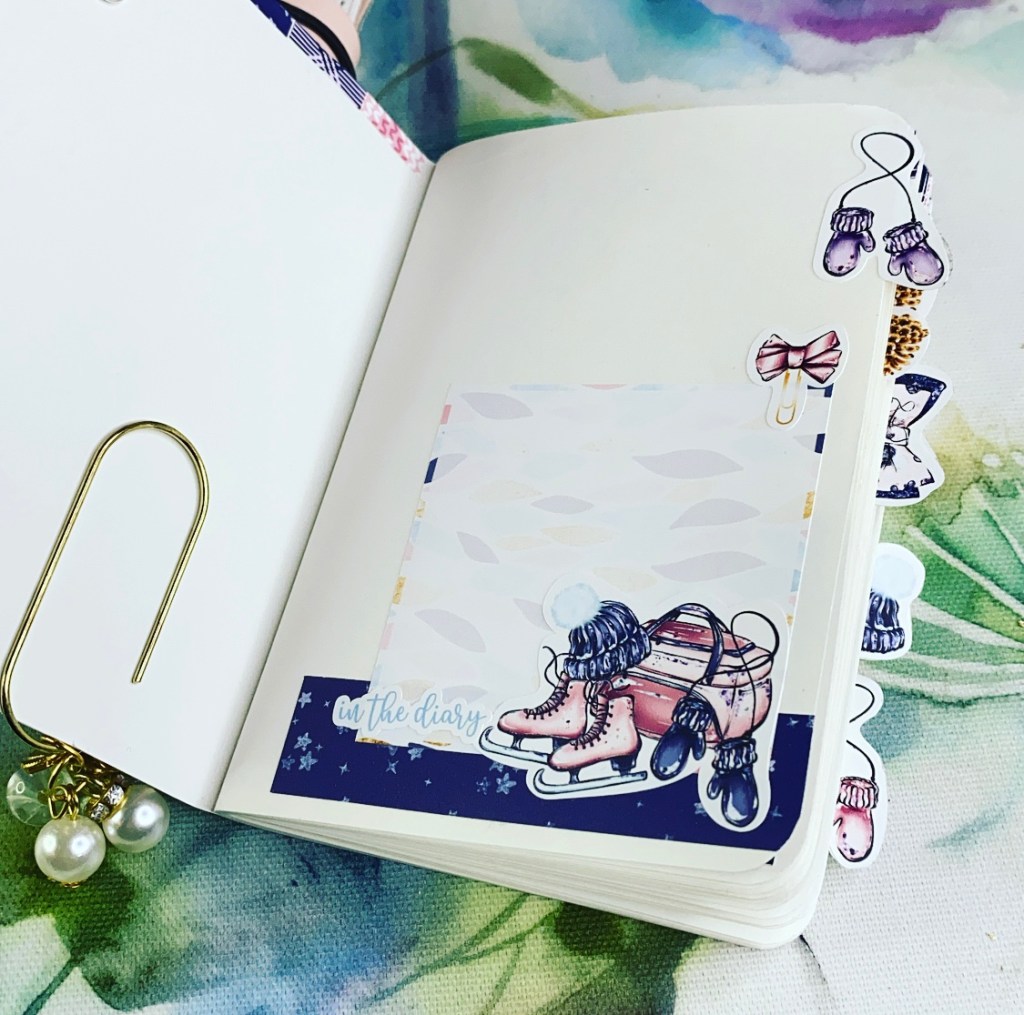 I like week on two pages so I used the first page to just decorate layering from the A5 Daily Extras sheet. I love that the different mitten colours are the same design mirrored so I was able to use them as tabs along with a few of the other deco pieces to split my notebook into weeks.