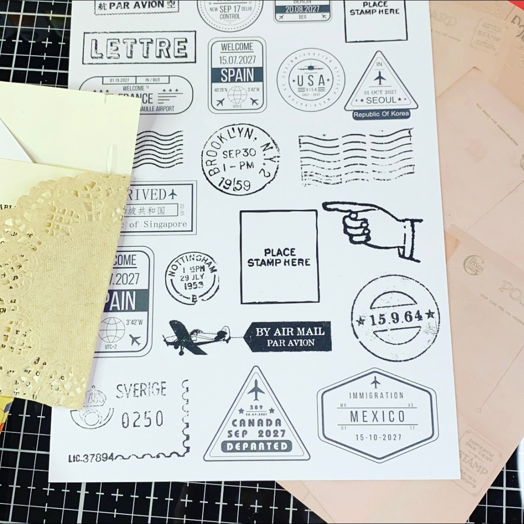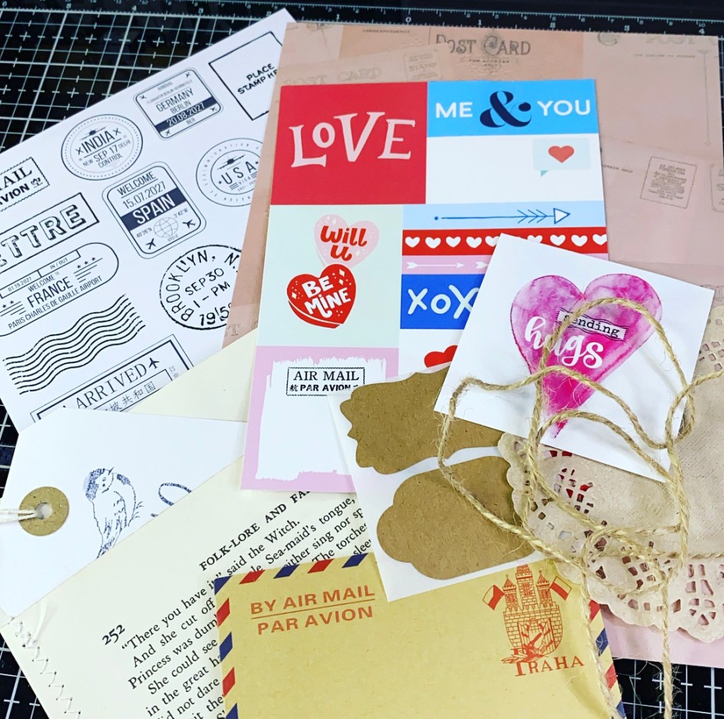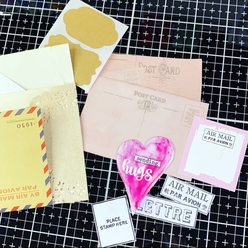 Today I am sharing how I have decorated one of the stitched envelopes that came in the kit. I picked out some of the pieces I wanted to incorporate.