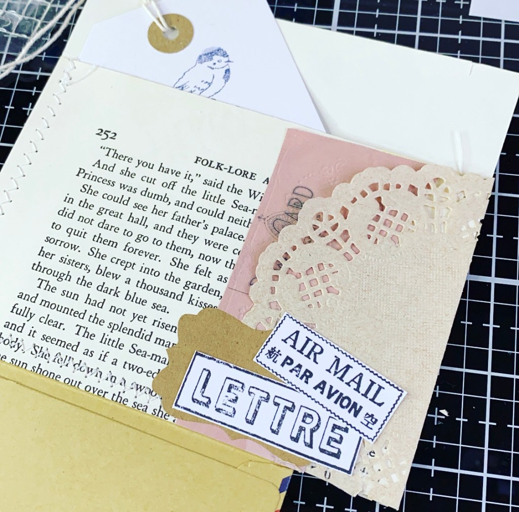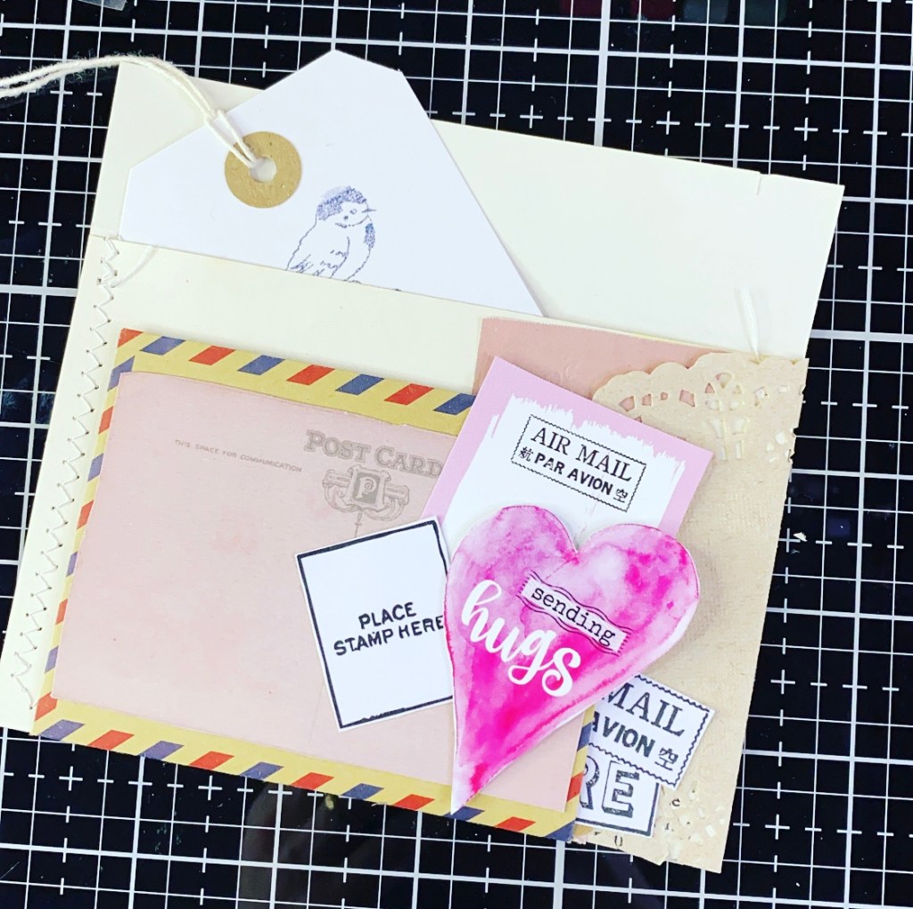 The envelope was upside down from adding the extra pocket so I used the postcard papers to decorate and layered some of the pieces I have cut out.