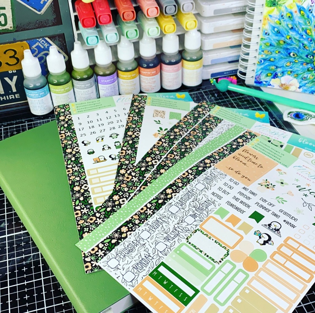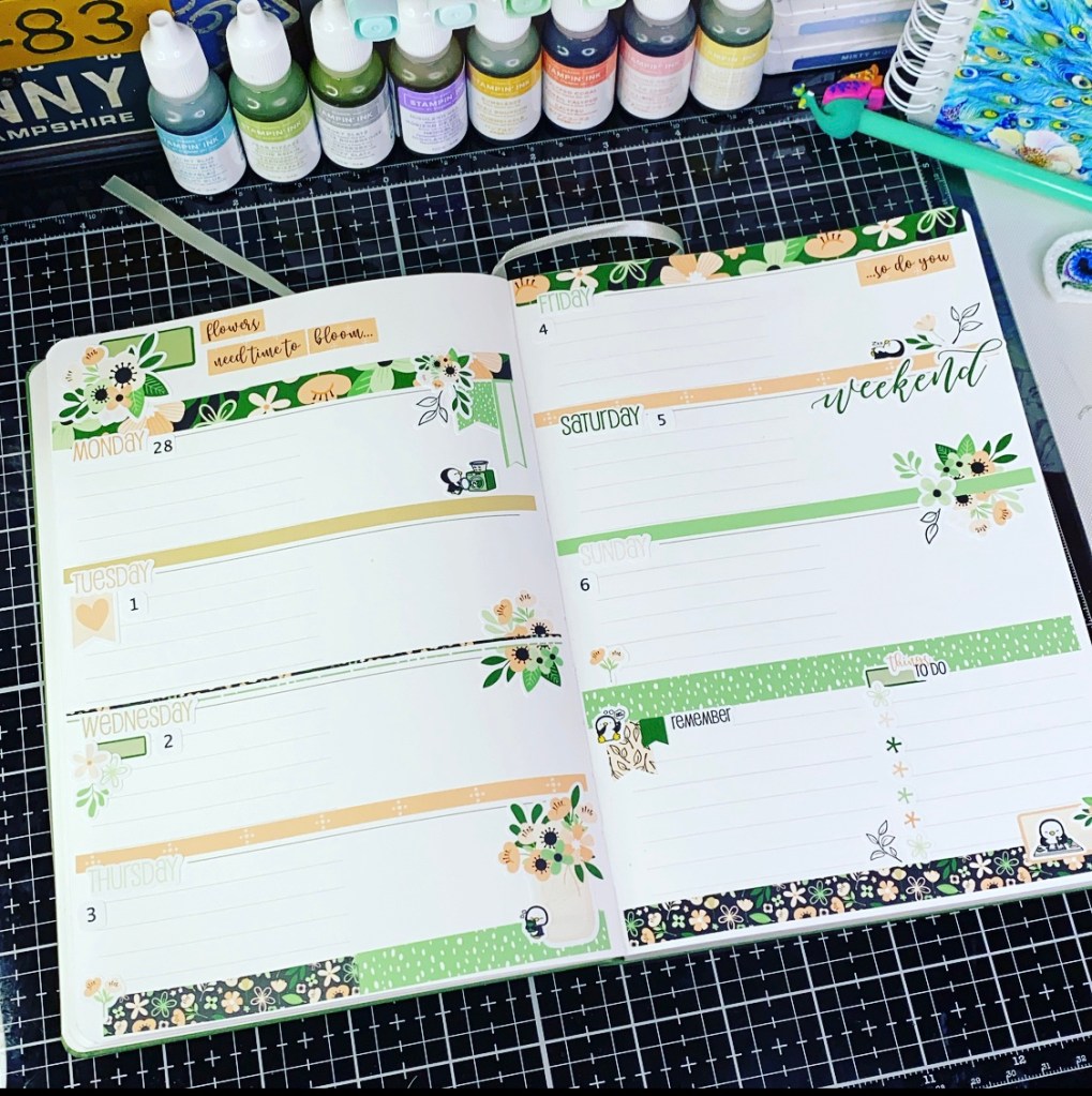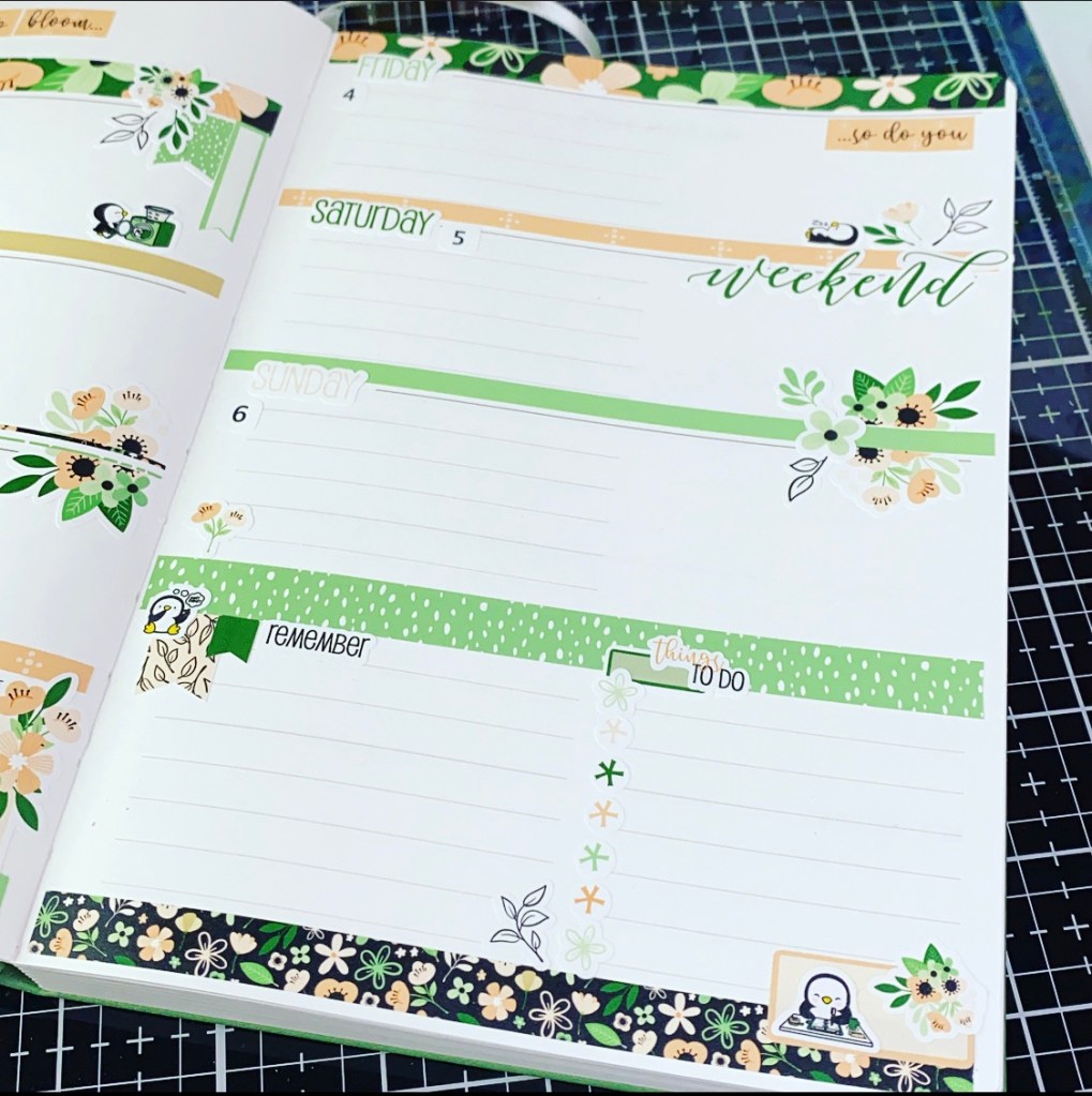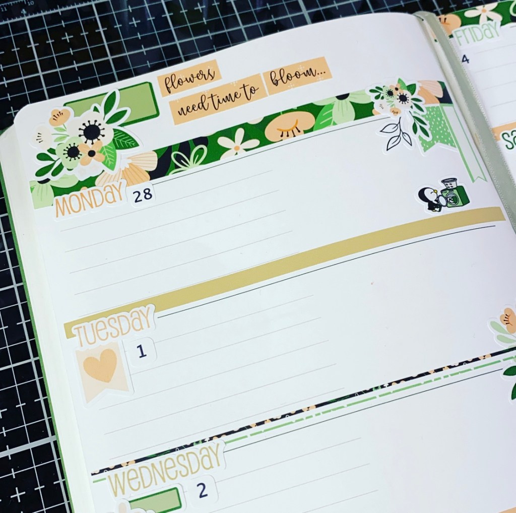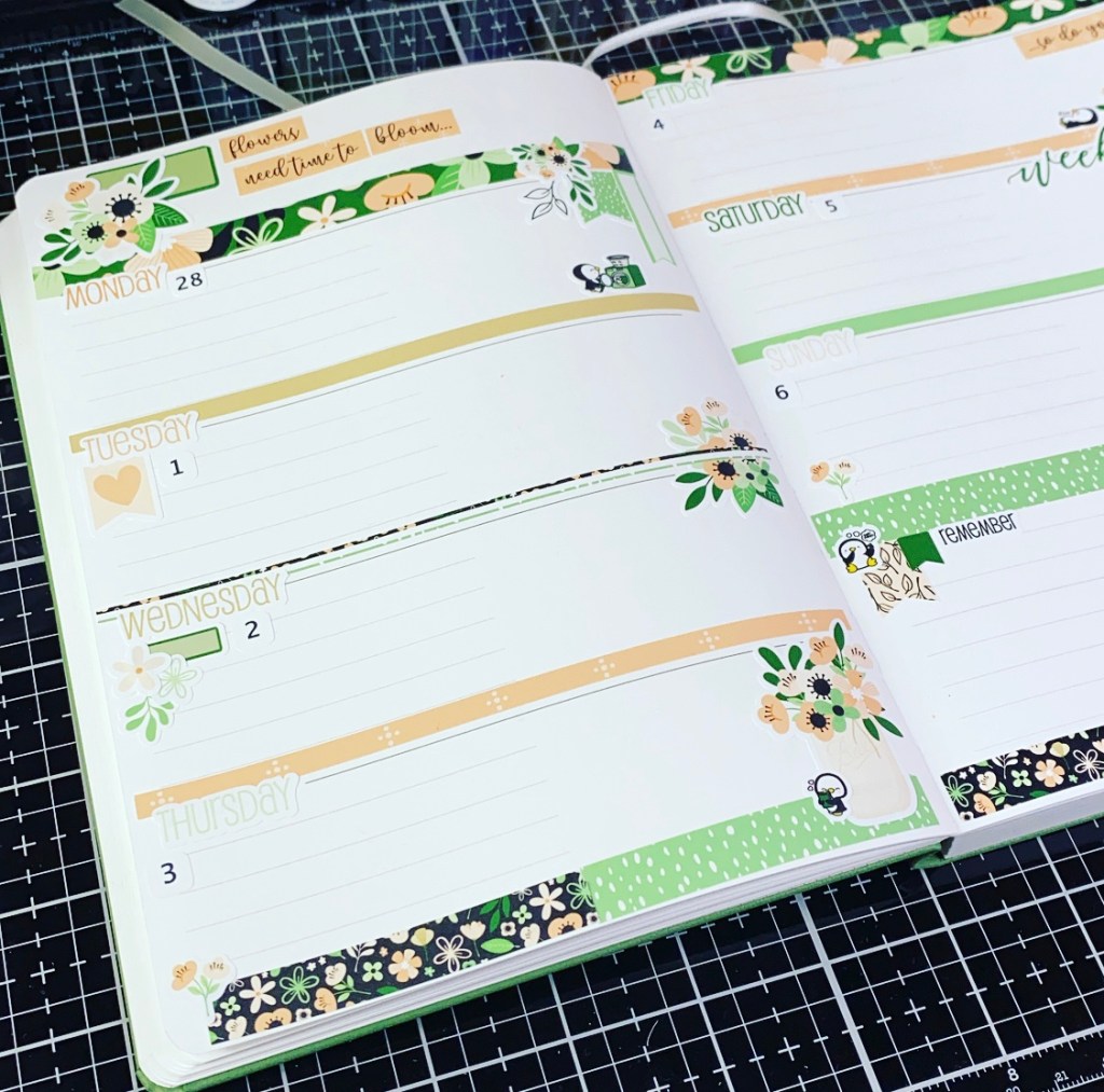 How perfect are the colours in the Bloom kit, I love the peach and greens together. It is definitely giving me spring feelings. The artwork is just gorgeous and I’m so tempted to add colour to the leaves on the days of the week strip.