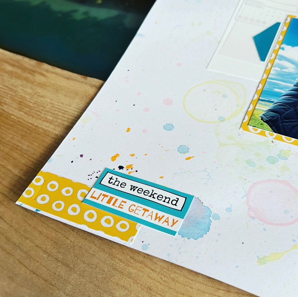 I place everything on my layout where I would like it to be before glueing them in place. The tag peaking out from behind my first photo matte. I still had some of the die cuts from a previous kit and the colours worked brilliant with the bubble background.