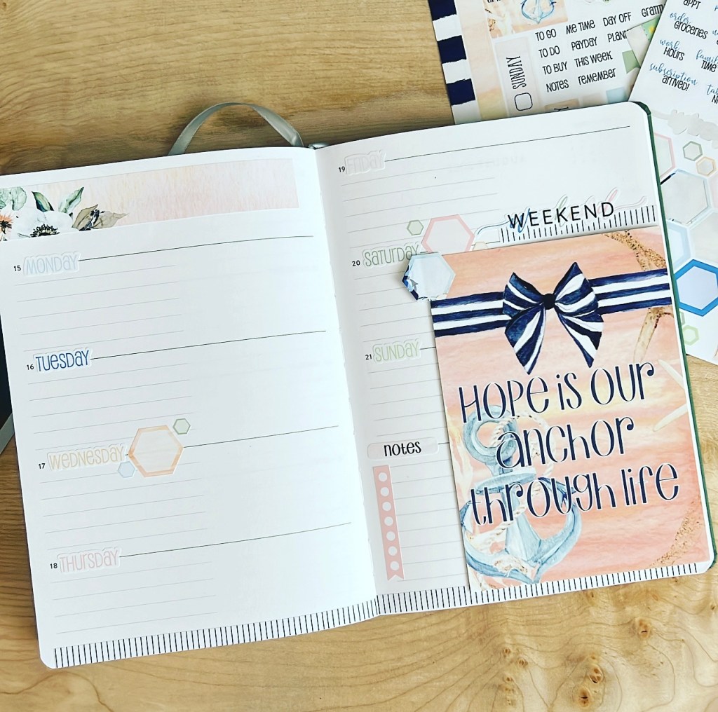 I added my stickers to my pages choosing the washi header, days of the week and the hexagon stickers. I had an extra piece of washi left so I have layered it with the weekend sticker and I love how it just shows above my tip-in.